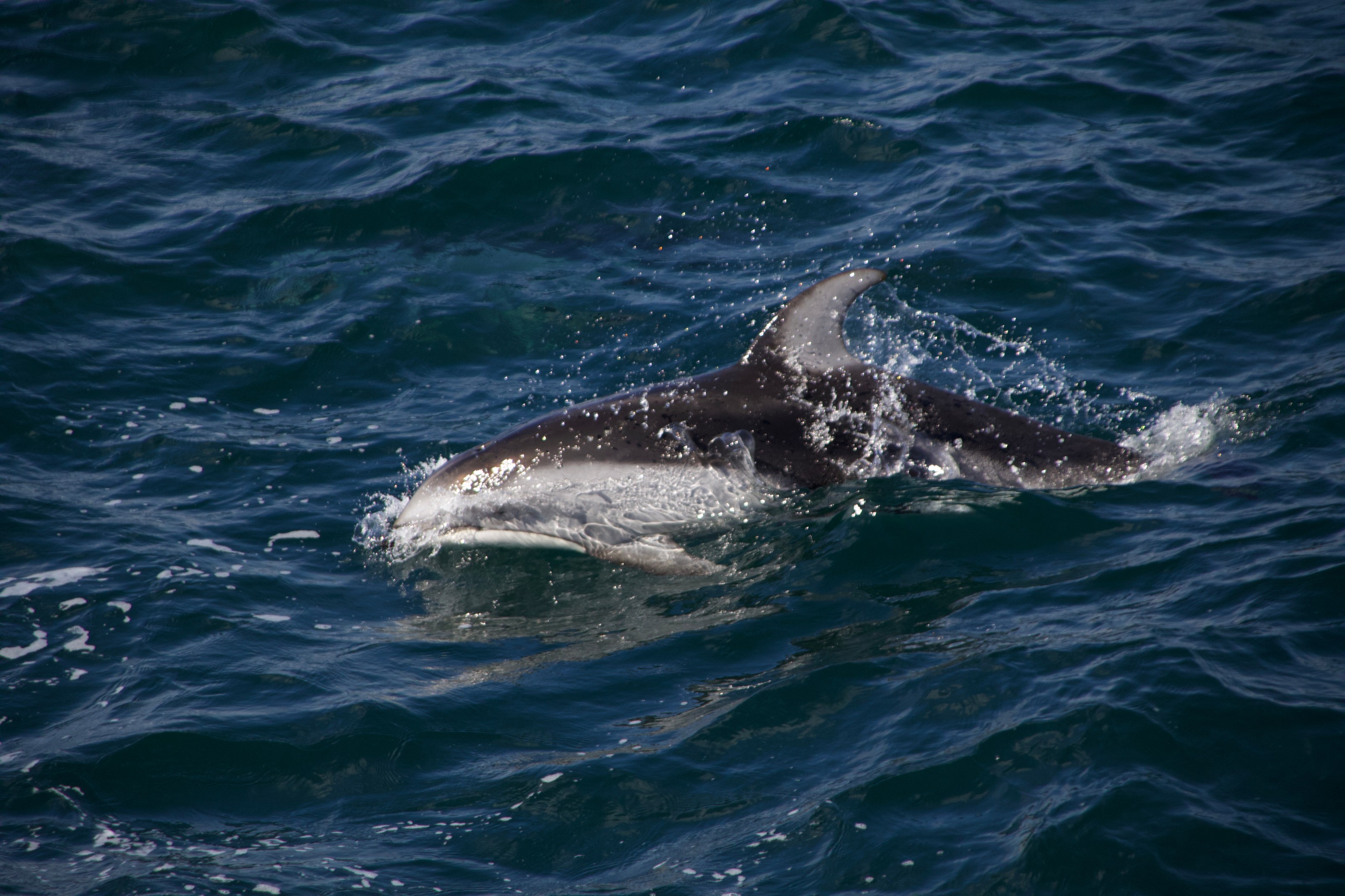 Dolphin swimming at the surface of the ocean with visible splashes.