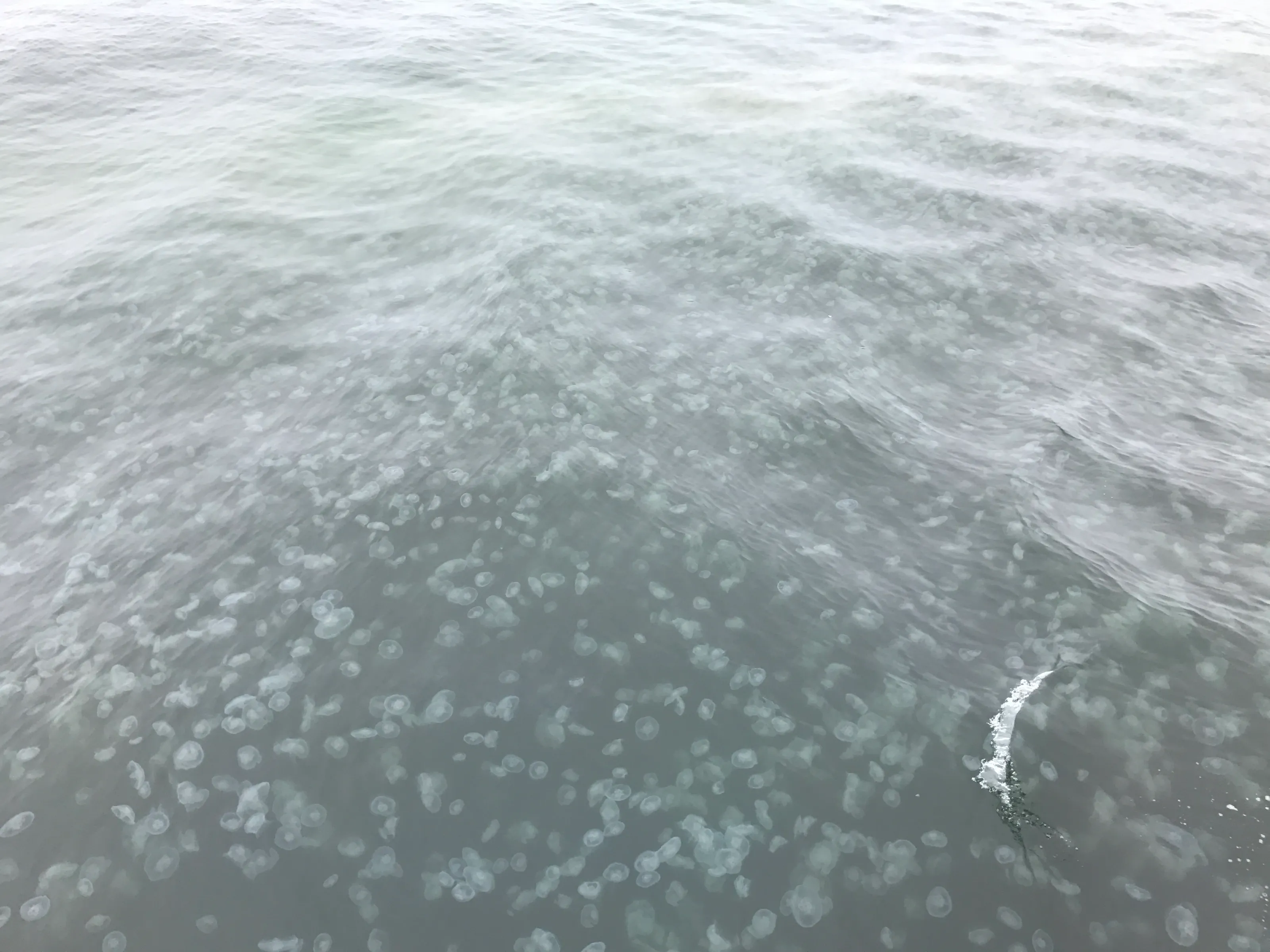 Aerial view of water with numerous translucent jellyfish and a small fish jumping.